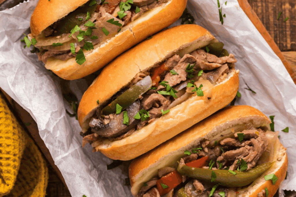 76er Cheesesteak: Grilled Steak, Mushrooms, Provolone Cheese Blend, Sauteed Onions, Green Chili, Jalapenos, and our Homemade Cheese Wiz.