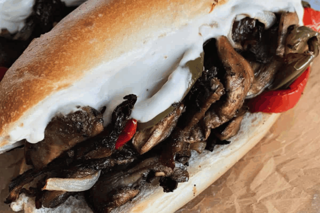 Shrooms & Cheese Cheesesteak (Vegetarian): Sauteed Mushrooms & Onions, Provolone Cheese Blend, & Balsamic Reduction (Green Chiles optional)