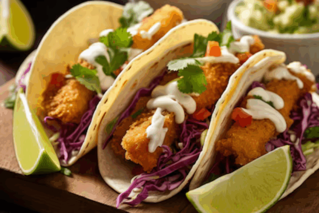 Baja Shrimp: Panko breaded fried shrimp, tomatillo avocado slaw, chipotle crema, and fresh cilantro.