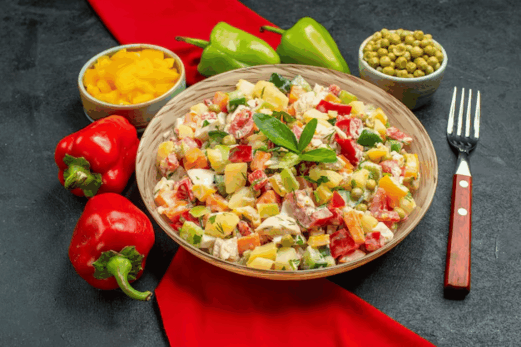 Classic Italian: Mixed Greens, Diced Tomatoes, Cucumbers, Red Onions, Parmesan Cheese, Croutons, Pepperoncini Peppers and Italian Dressing.