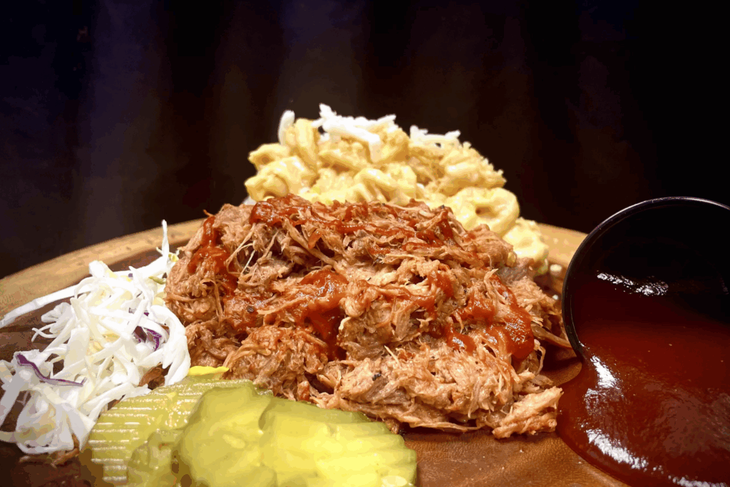 Pig Rig: Smoked BBQ Pork, apple slaw, crispy dill pickle chips, house barbecue sauce drizzle.