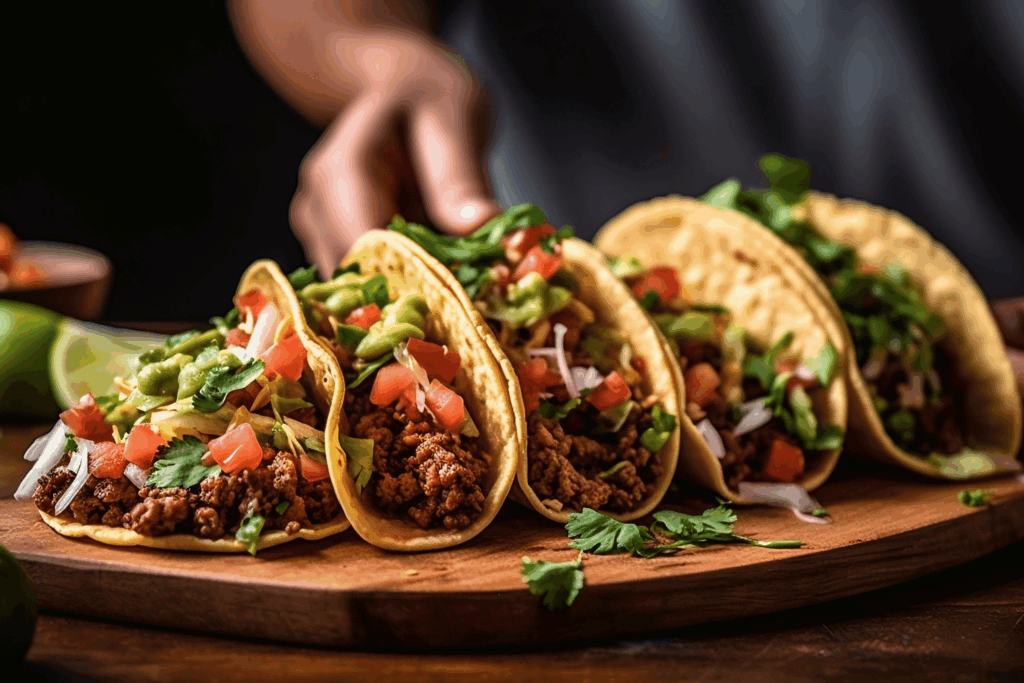Taco: Seasoned taco beef, black beans, pico, cilantro.